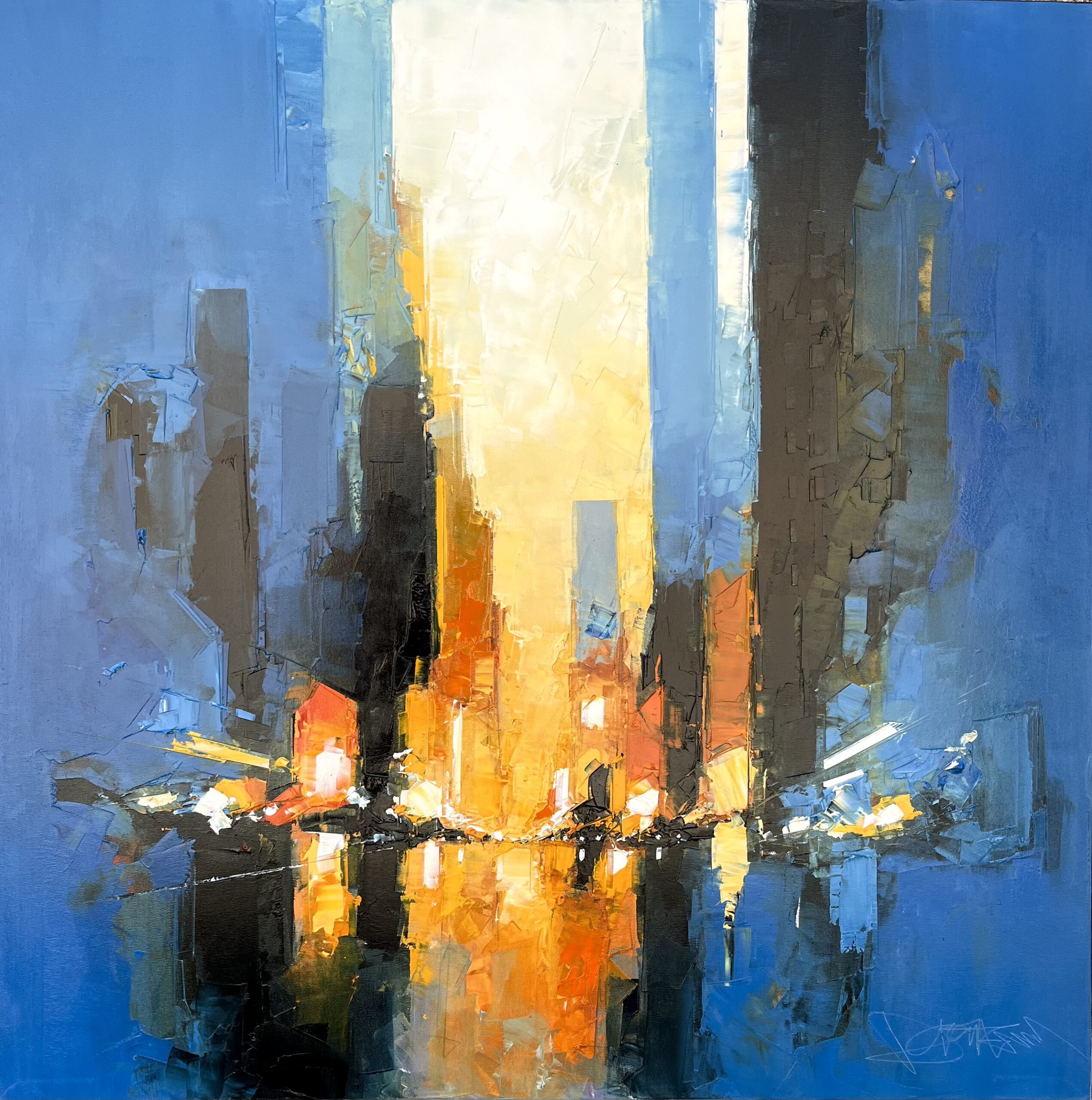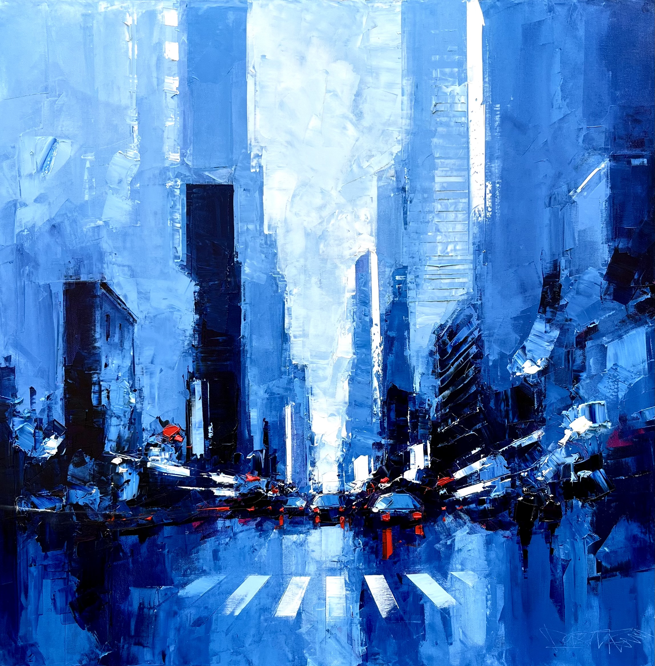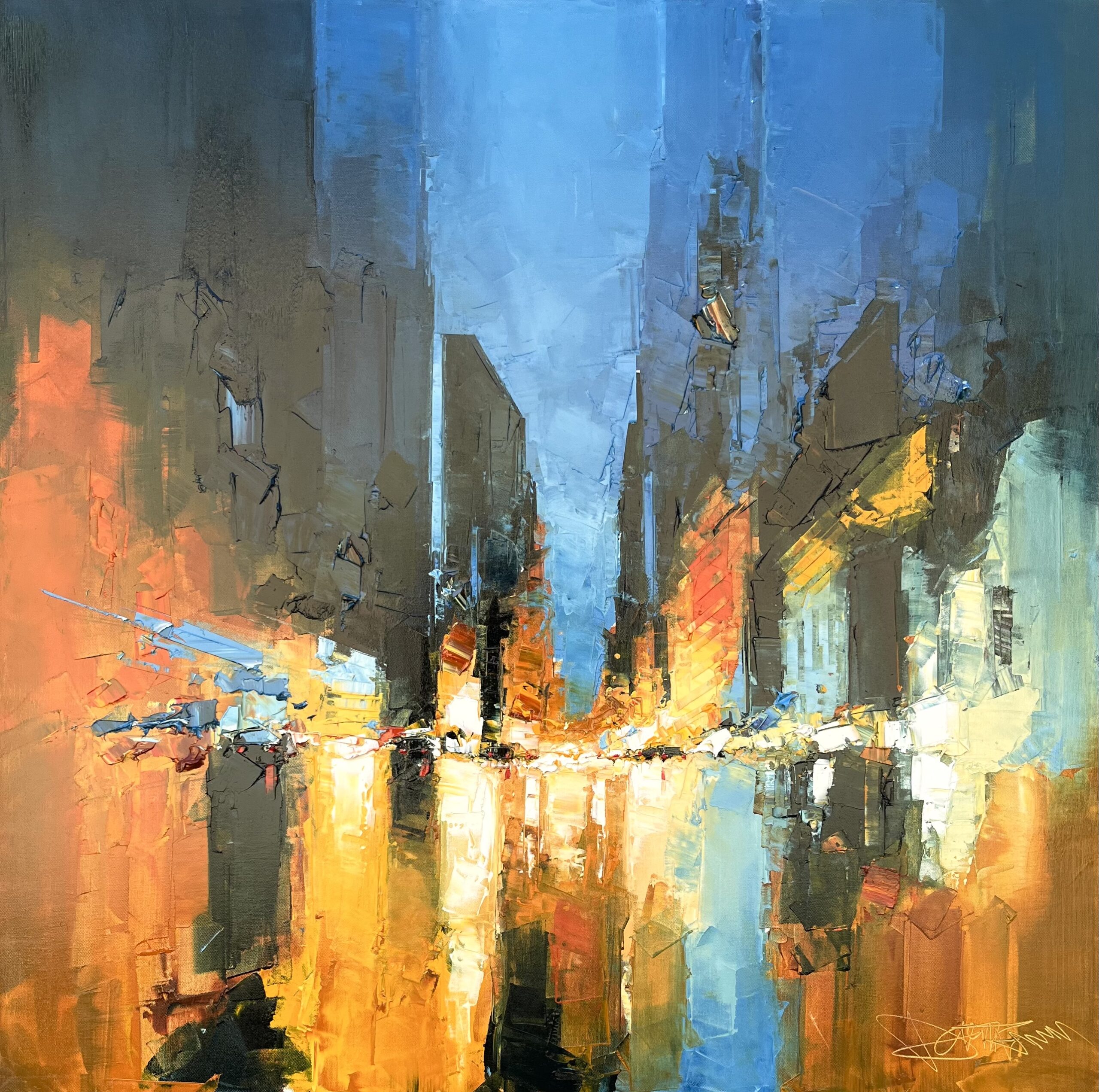 Dans une première vie professionnelle, l’artiste Daniel Castan a beaucoup voyagé à New York et à Hong Kong. Il en garde une fascination pour les univers urbains et leurs perspectives démesurées. Dans ses toiles, il essaie de recréer ces ambiances très graphiques. Les lignes des immeubles se perdent dans le ciel, les larges avenues semblent sans fin, les couleurs s’entrechoquent. L’artiste travaille d’après ses souvenirs, son imagination.