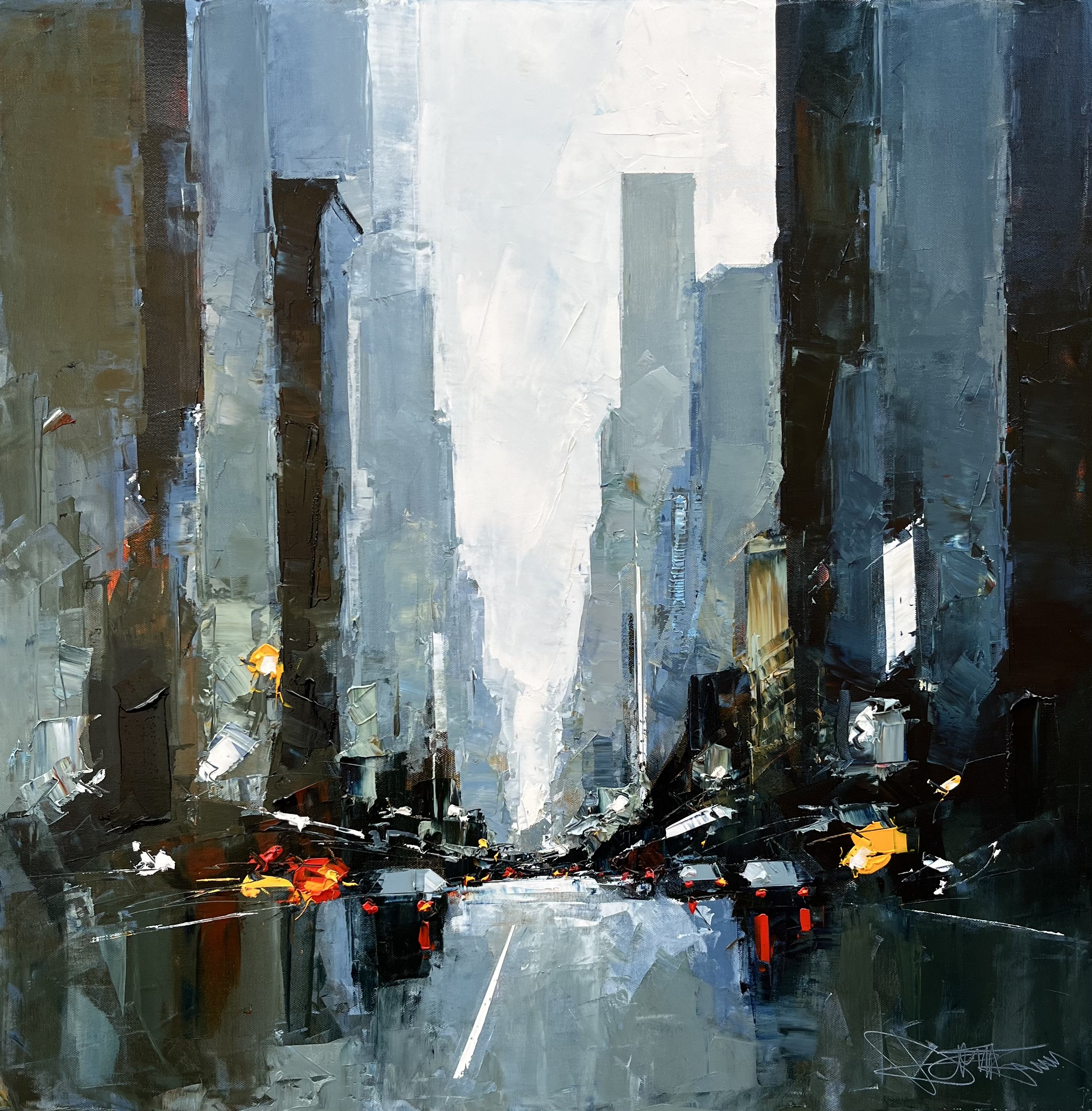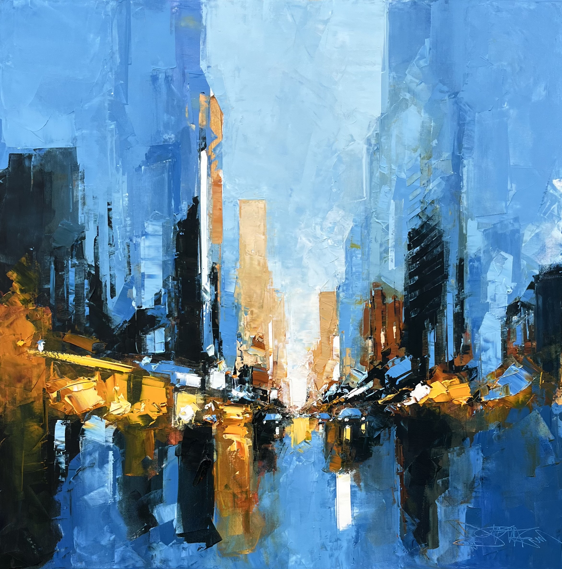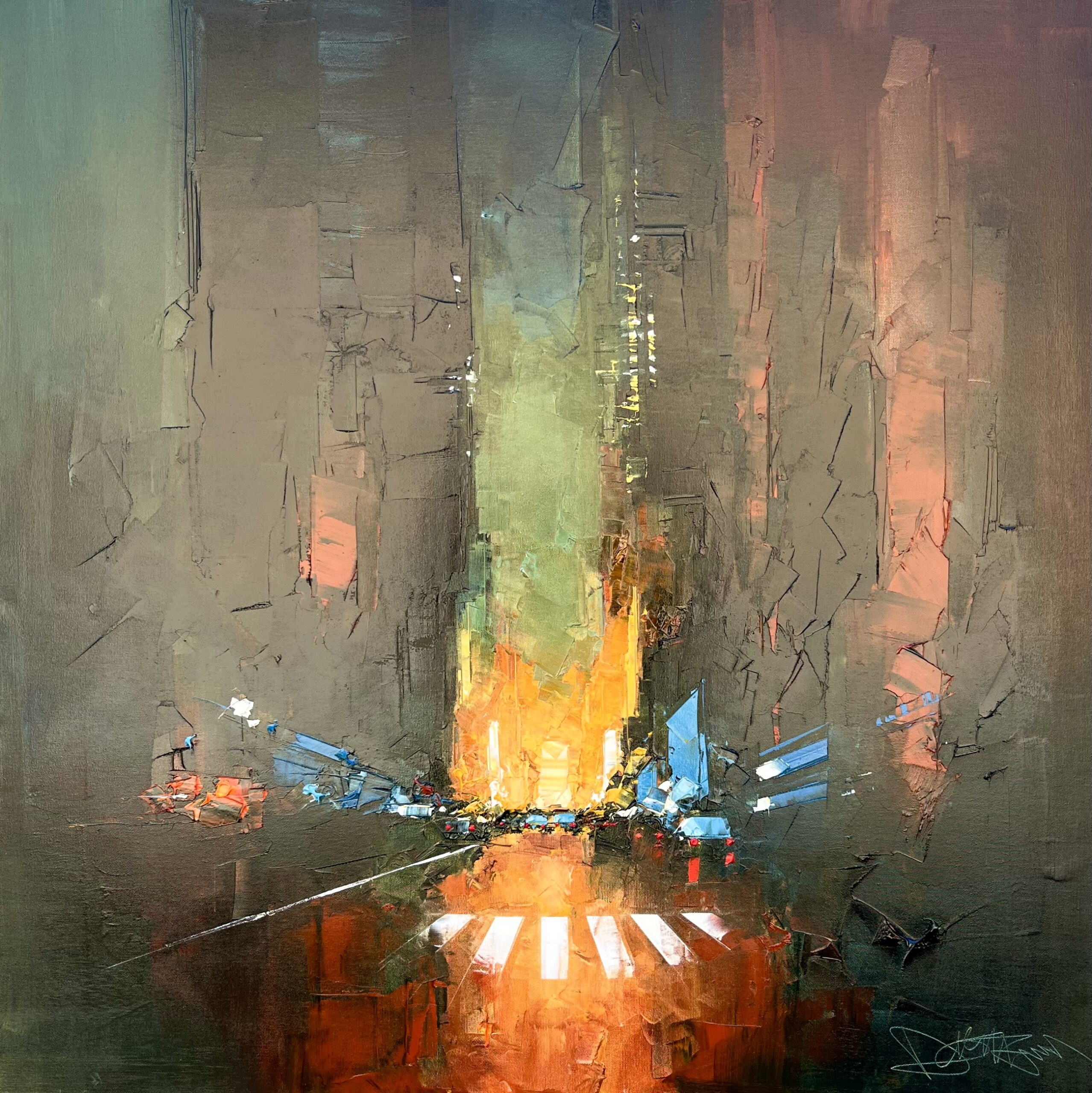 Dans une première vie professionnelle, l’artiste Daniel Castan a beaucoup voyagé à New York et à Hong Kong. Il en garde une fascination pour les univers urbains et leurs perspectives démesurées. Dans ses toiles, il essaie de recréer ces ambiances très graphiques. Les lignes des immeubles se perdent dans le ciel, les larges avenues semblent sans fin, les couleurs s’entrechoquent. L’artiste travaille d’après ses souvenirs, son imagination.