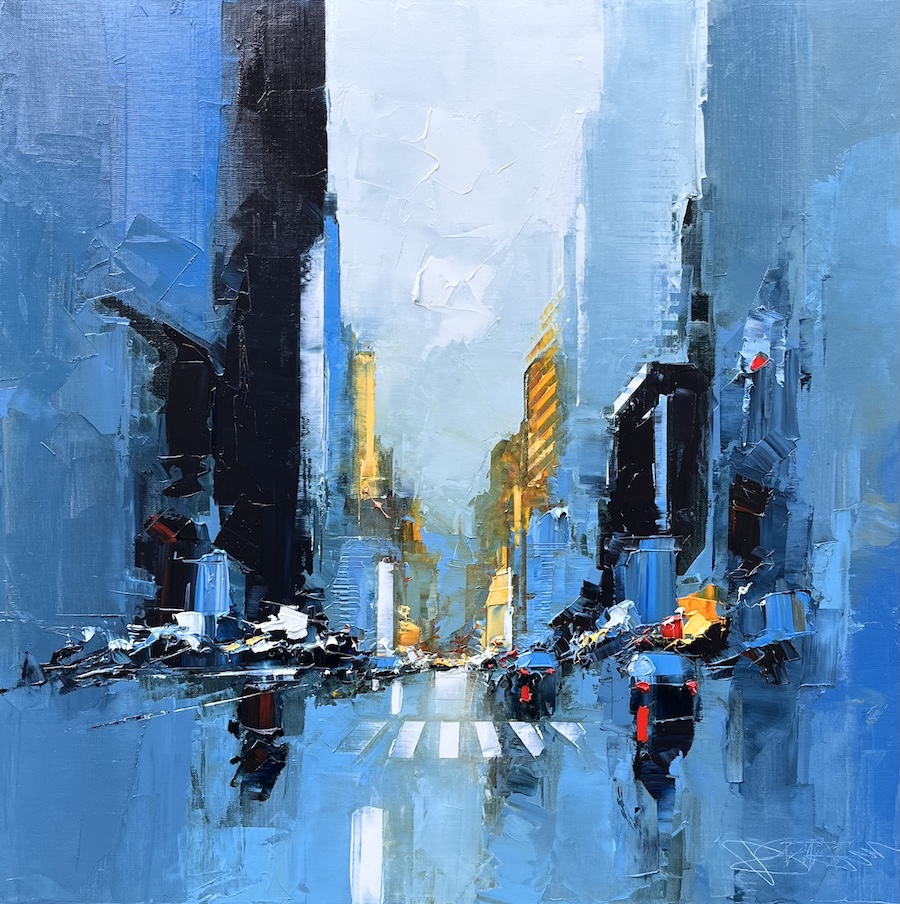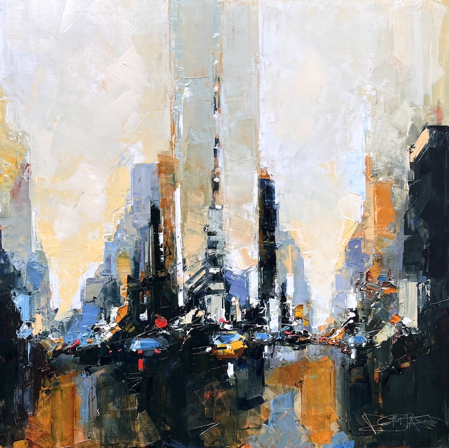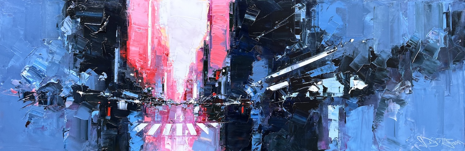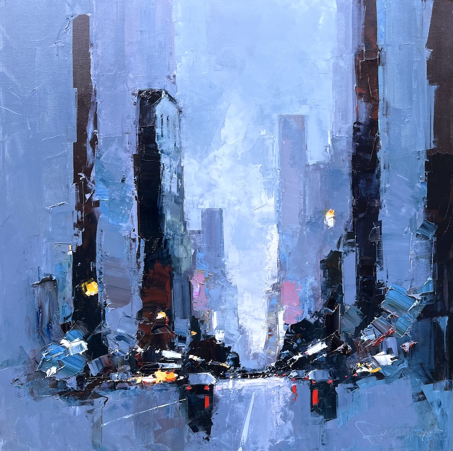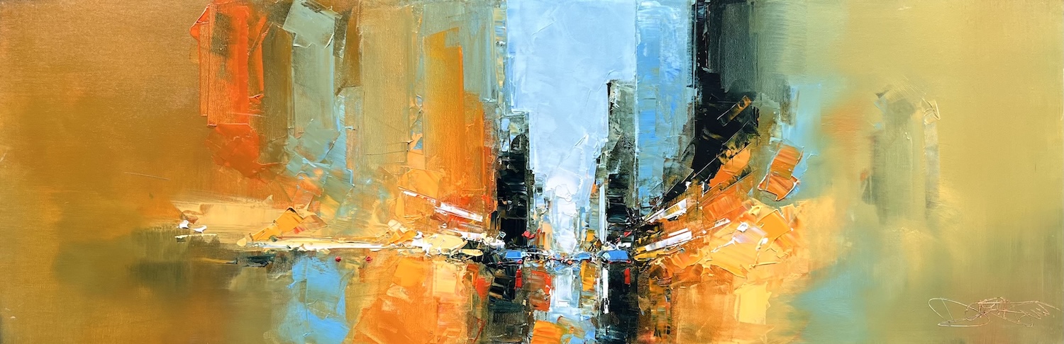 Né en 1959 en Dordogne, Daniel Castan dessine depuis son tout jeune âge. Diplômé des Beaux Arts de Bordeaux, il travaille en tant que graphiste-designer, crée sa société et exécute des travaux pour l’Unicef, Pierre Balmain, l’Onu, Zippo, Polyflamme… Puis à 40 ans, il reprend le pinceau pour le plaisir et rien que pour le plaisir. À 48 ans, il lâche tout pour vivre son rêve… Dans une première vie professionnelle, l’artiste Daniel Castan a beaucoup voyagé à New York et à Hong Kong. Il en garde une fascination pour les univers urbains et leurs perspectives démesurées. Dans ses toiles, il essaie de recréer ces ambiances très graphiques. Les lignes des immeubles se perdent dans le ciel, les larges avenues semblent sans fin, les couleurs s’entrechoquent. L’artiste travaille d’après ses souvenirs, son imagination. Daniel Castan a choisi de peindre avec une huile alkyde. Celle-ci se travaille comme l’huile classique, mais son liant est une résine qui permet un séchage accéléré. Le couteau, quant à lui, est l’outil de prédilection de l’artiste. Il lui permet de travailler à la fois en pâte, en large touche, et de dessiner dans la matière.